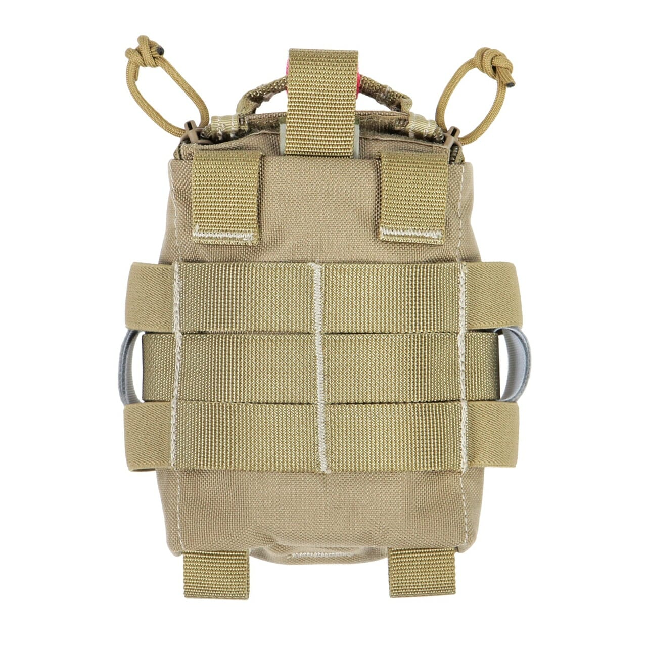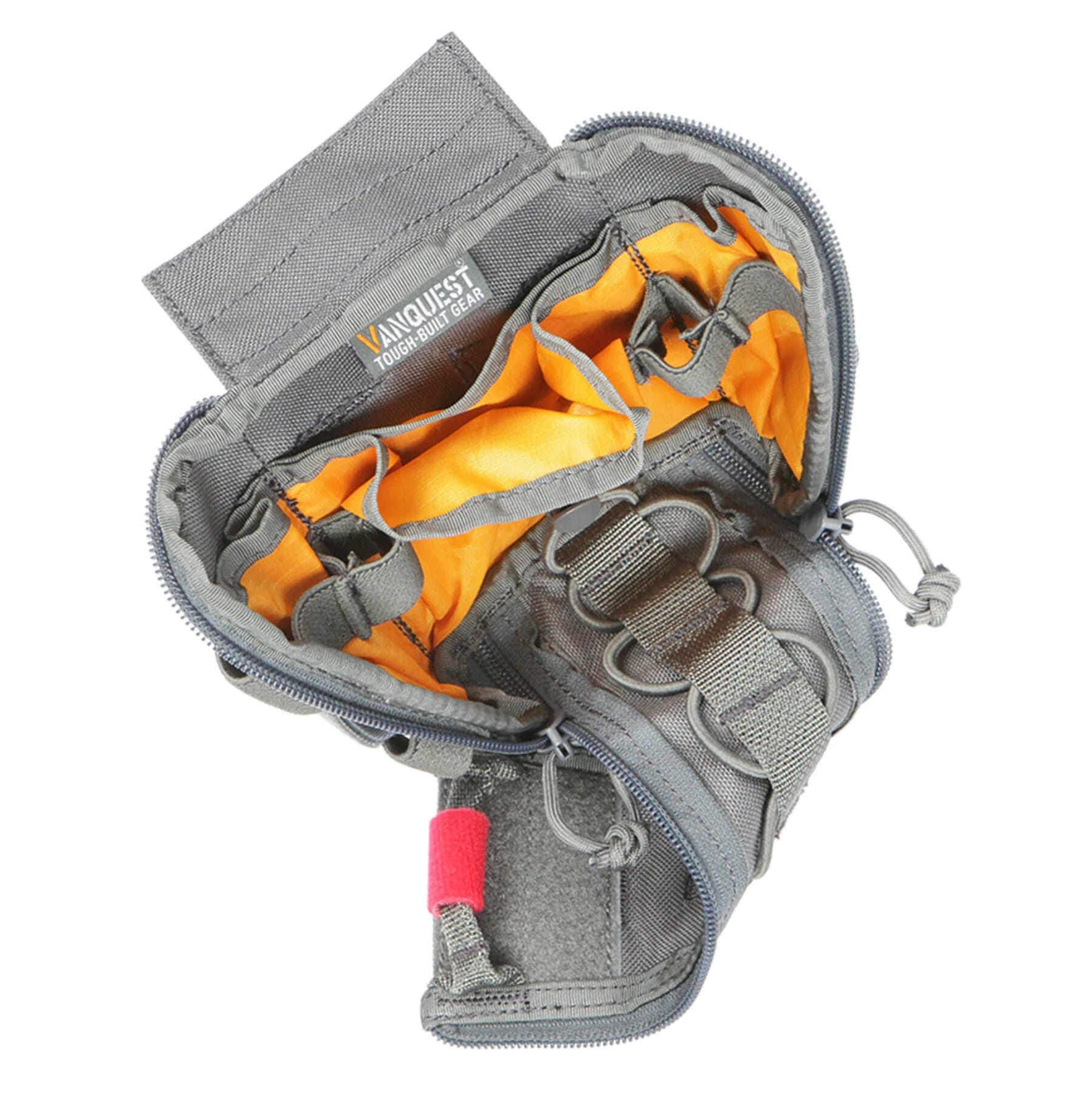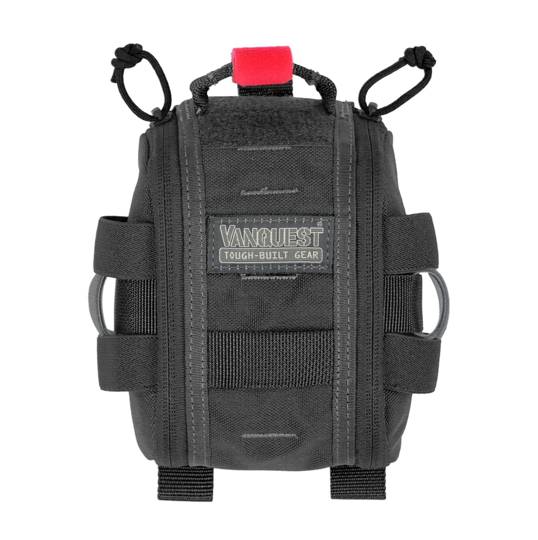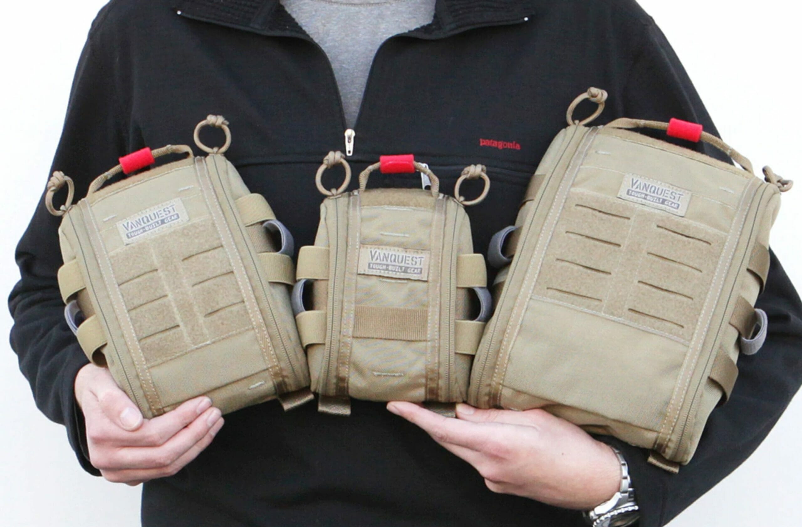 Vanquest Gen-2 FATPack 4×6 improvements: (1) external built-in tourniquet holders, (2) internal elastic holders for cylindrical items, (3) bottom pull tabs for easy closure.
