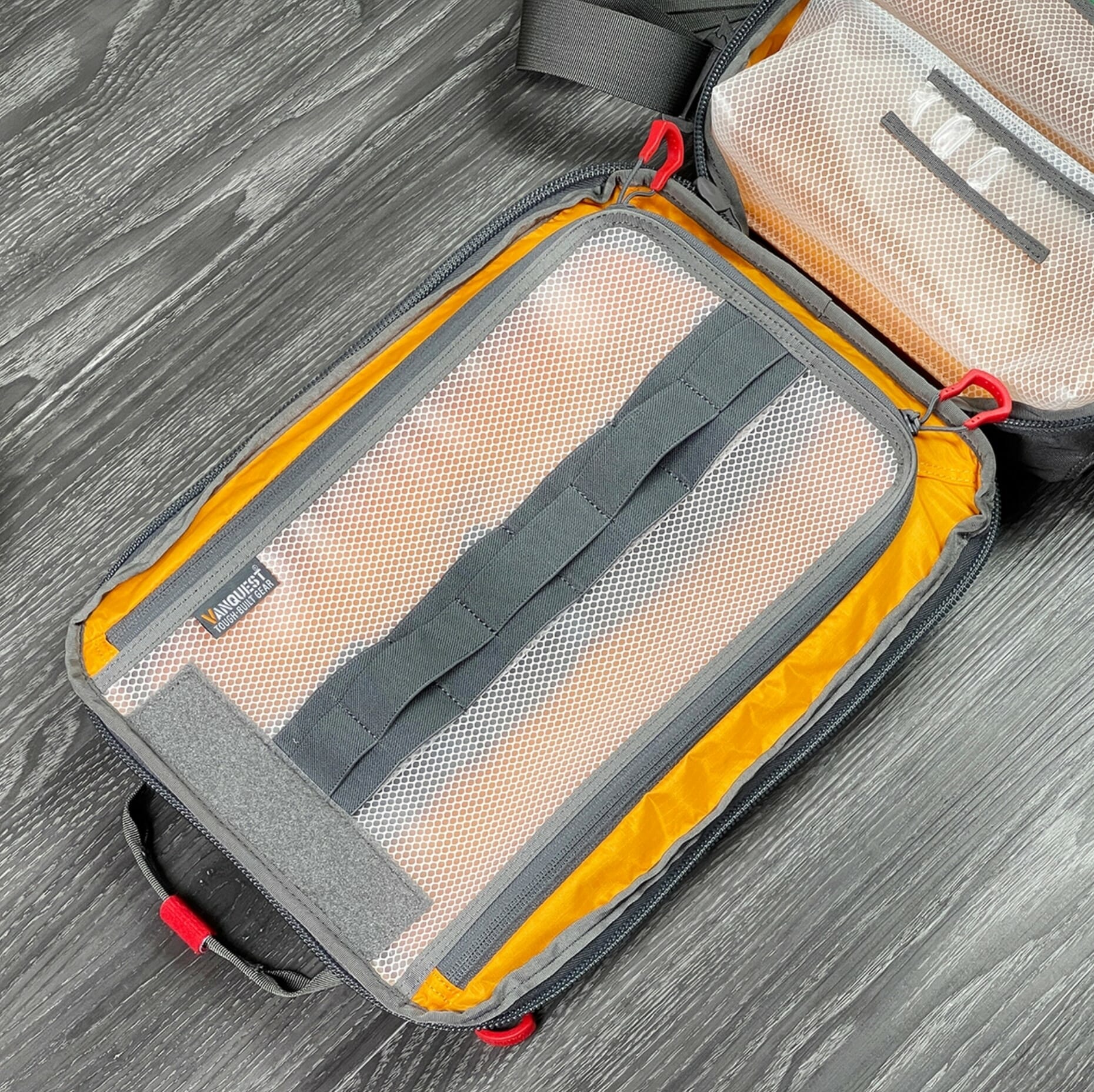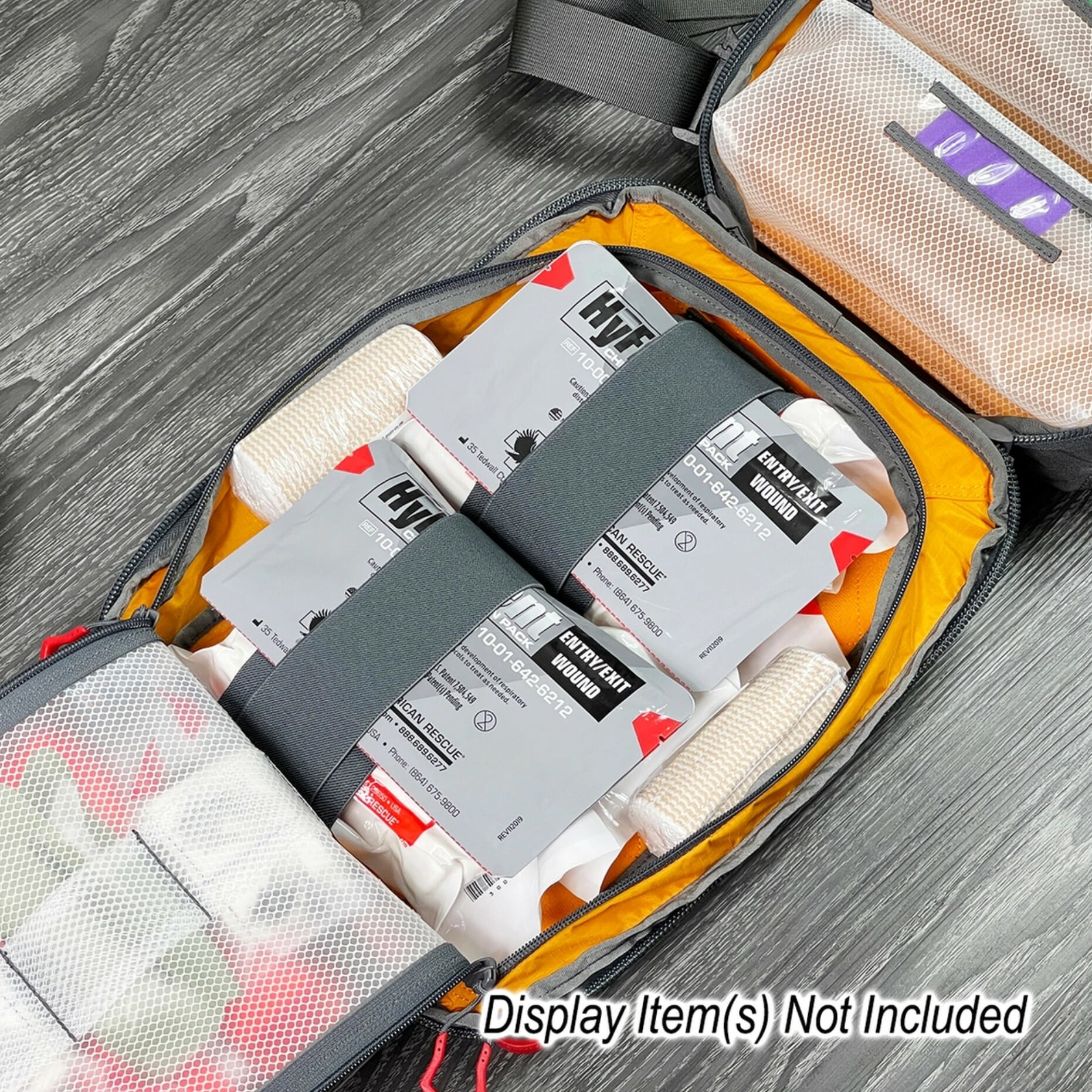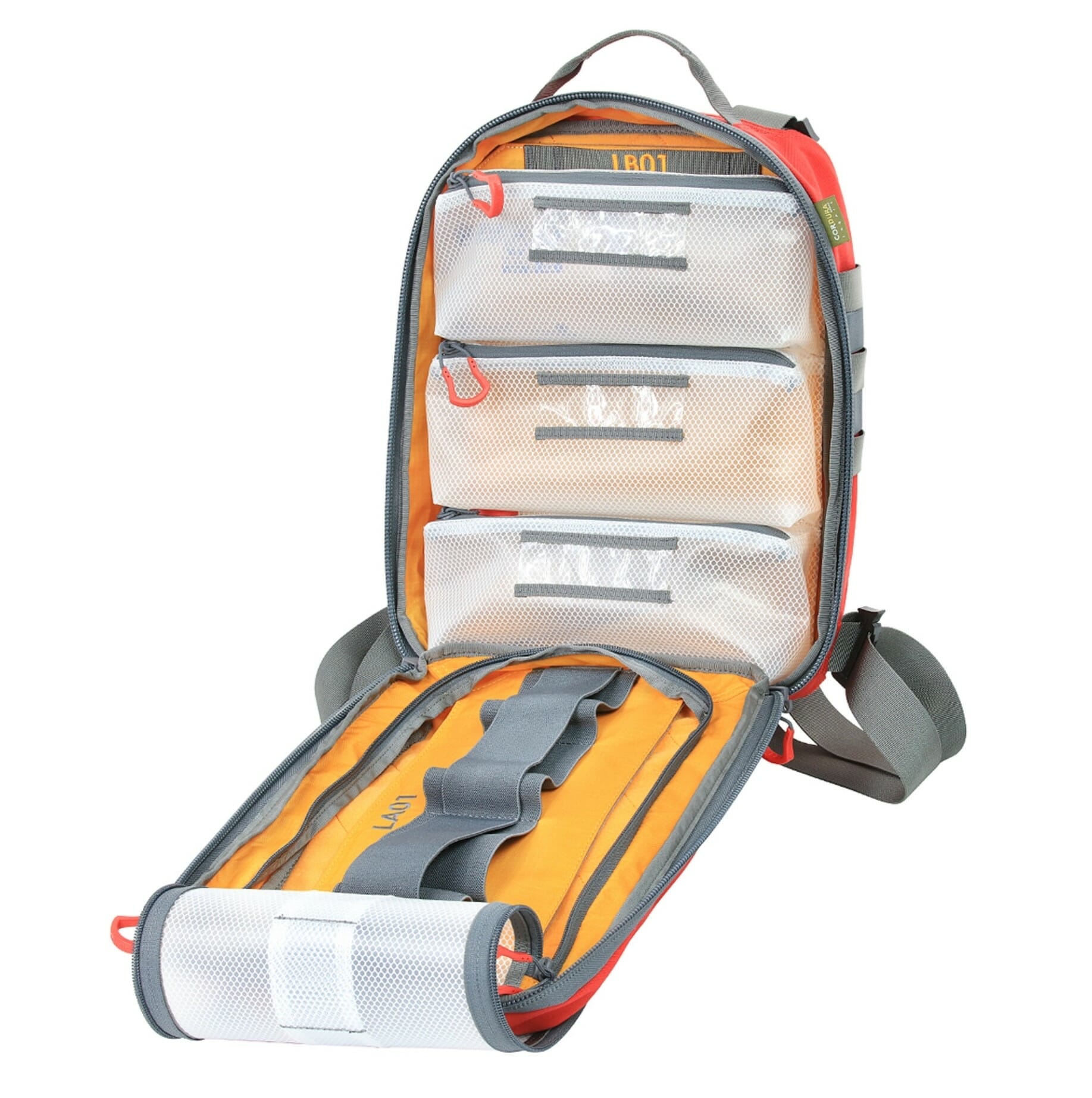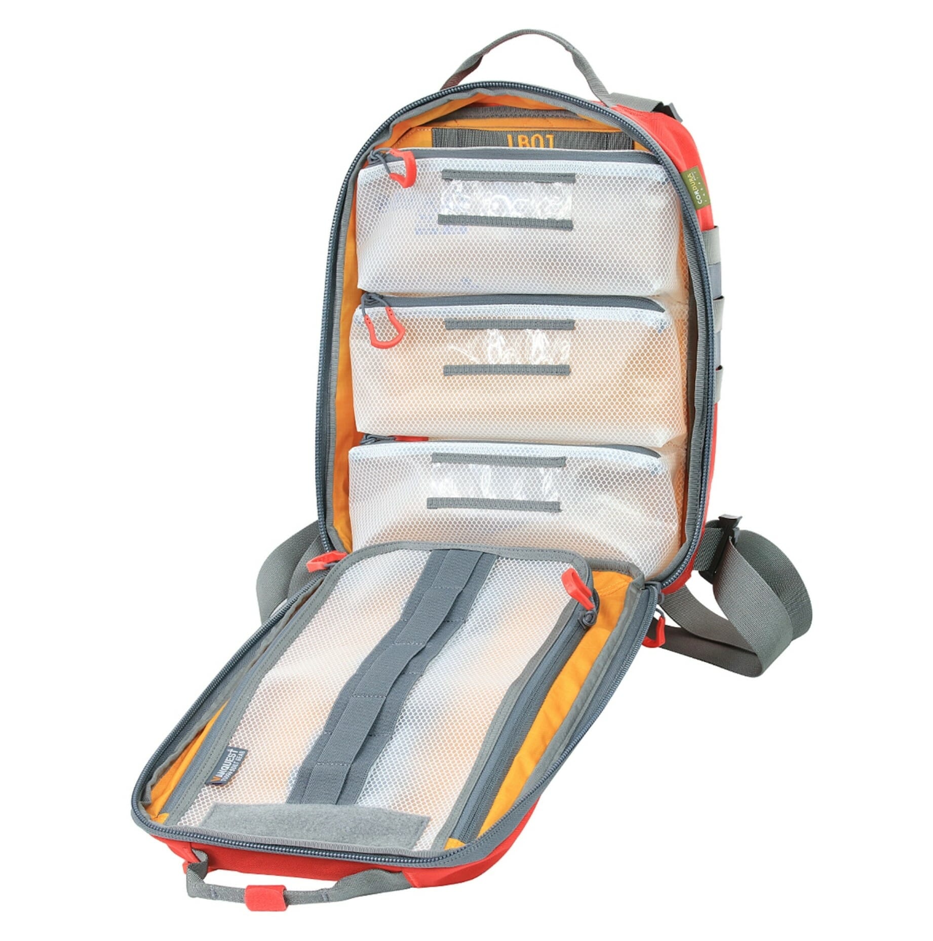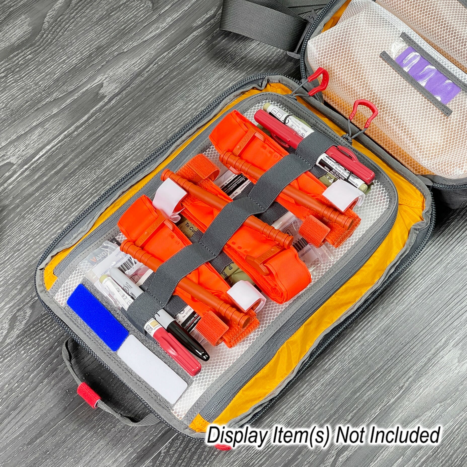 Dual layers of Elastic loop over high-viz ripstop pockets in the main compartment provide quick access storage for multiple trauma supplies. Items such as tourniquets, wound packing gauze, pressure bandages, chest seals, and airway management tools will fit securely and prominently – saving you precious time when seconds count. Three vinyl mesh zippered pouches with content label windows offer additional storage of injury specific gear or PPE items. Both the three zippered pocket and lower elastic loop panels are removable.