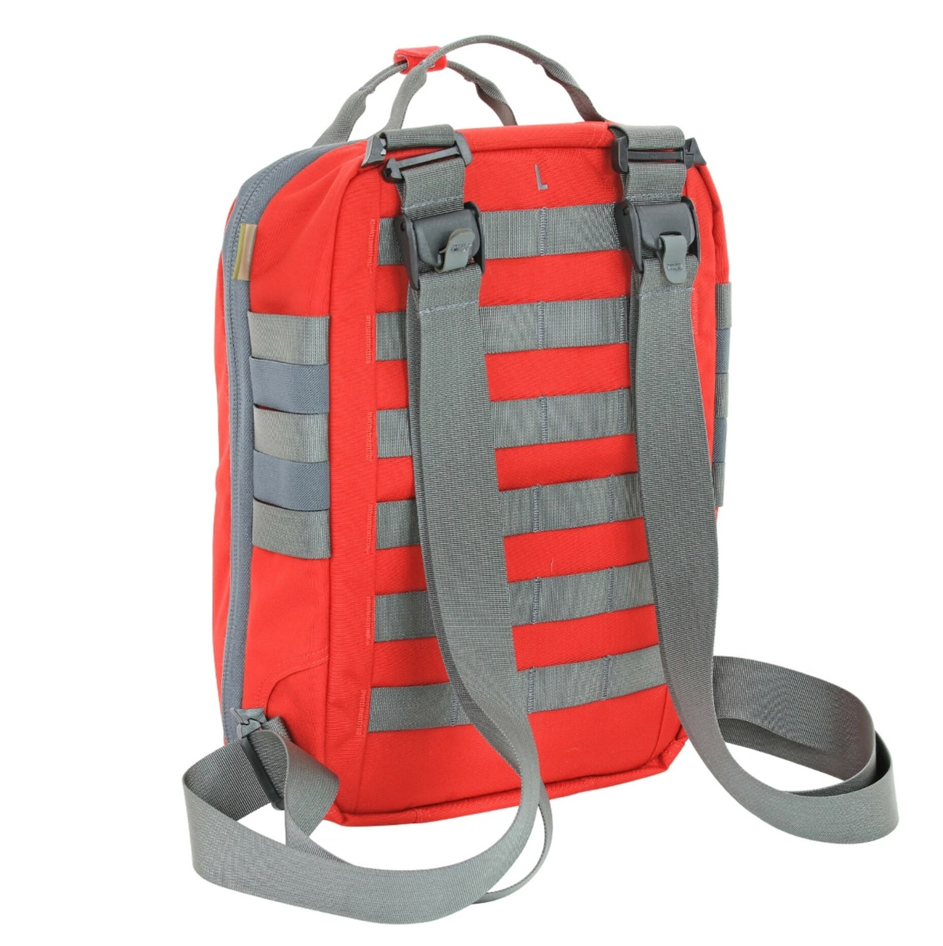 One flat zippered pocket a Loop ID panel 4.5″ (W) x 3″ (H) and two bandage shear sheaths with a large RED pull handle make the front of the bag. Side MOLLE and elastic webbing offer storage for extra tourniquets or pouches.