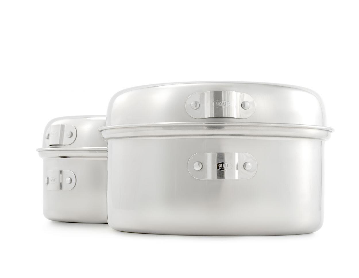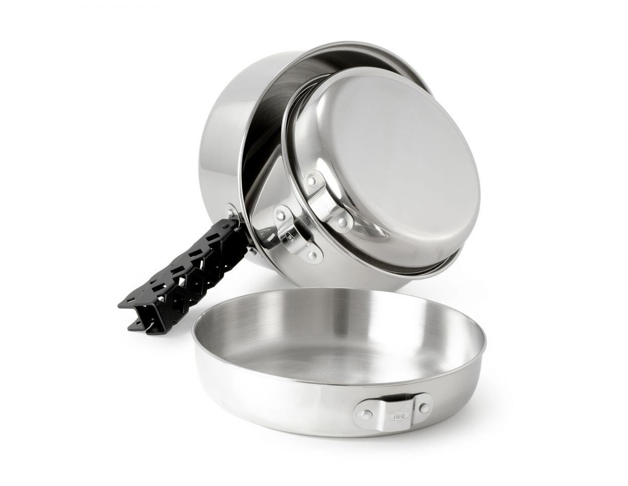 Lightweight, nesting design with dual-use frypan/lids packs small, travels easily and withstands abuse.