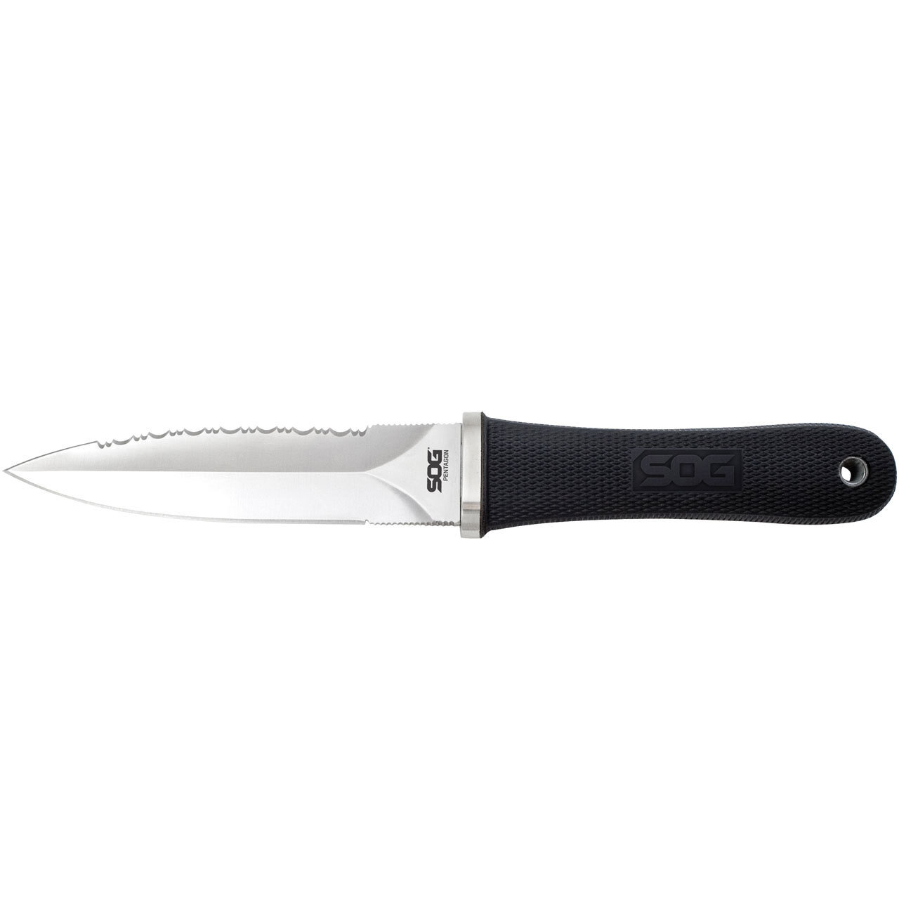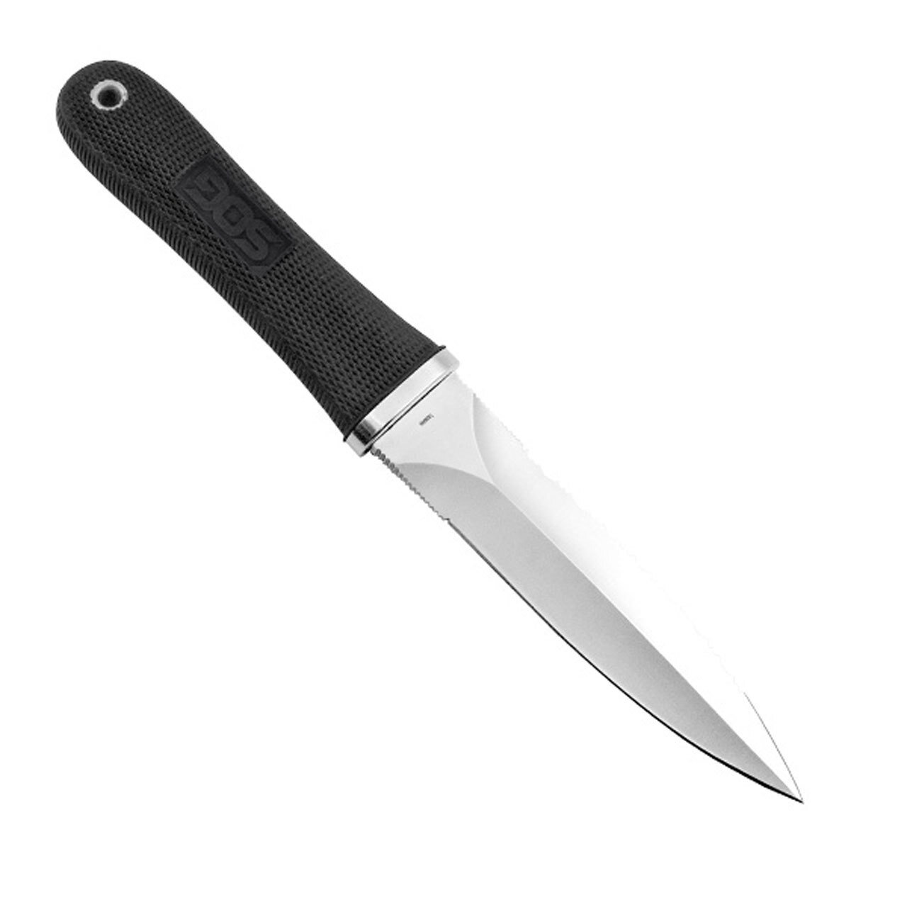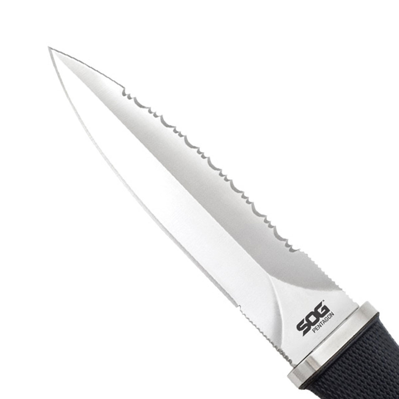 Originally designed as back-up for law enforcement and military personnel, the Pentagon series is now popular with outdoor knife enthusiasts as well. The Pentagon offers the instant choice between a serrated or beveled edge on its AUS-8 blade for cutting options. Twin thumb notches enable accurate blade orientation and downward control. The aggressively checkered, flared handles provide confident gripping as well as sensational feel and balance. Comes with a tactical nylon sheath. Item S14-N