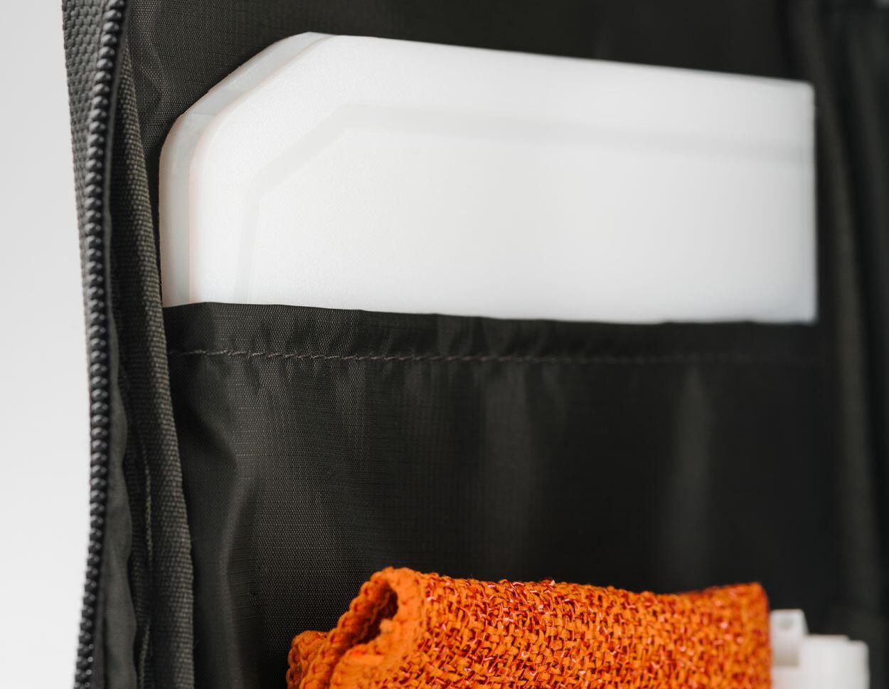 The set contains a 10cm Paring Knife with Sheath, 15cm Santoku Chef’s Knife, 15cm Serrated Bread Knife, Folding Cutting Board, Soap Bottle, Dish Cloth, all housed in a Ballistic Nylon Case to keep the set neatly organised and protected. All three knives come in sheaths to preserve blade sharpness and ensure safe storage when not in use.