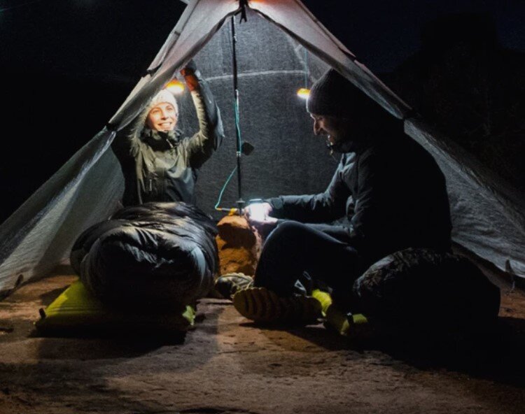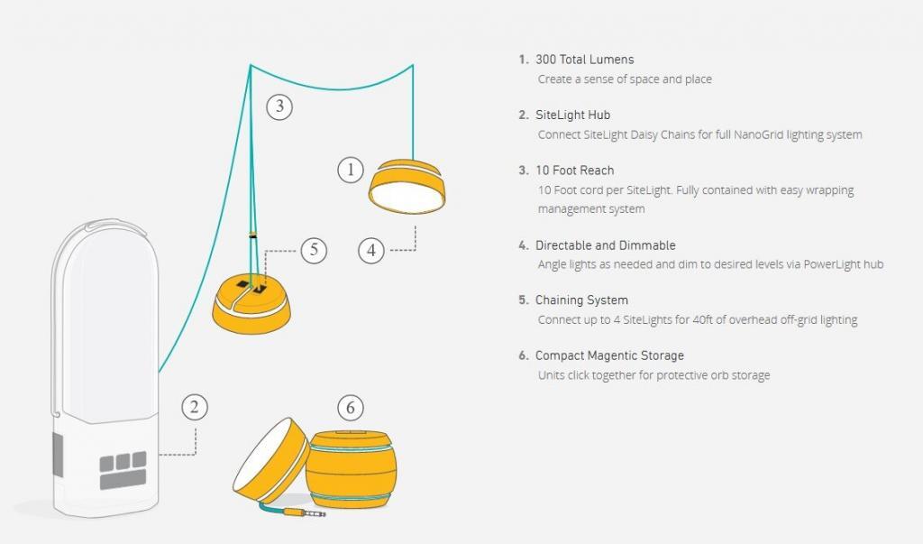 Create a sense of space and place with SiteLights, a daisy-chaining light system that provides warm and highly functional overhead light at your site. For use with the BioLite PowerLight or BaseLantern, these dimmable SiteLights come 2 per set and each light emits 150 lumens and contains 3M of cord. The set packs down easily into a compact protective sphere with effortless cord management.
