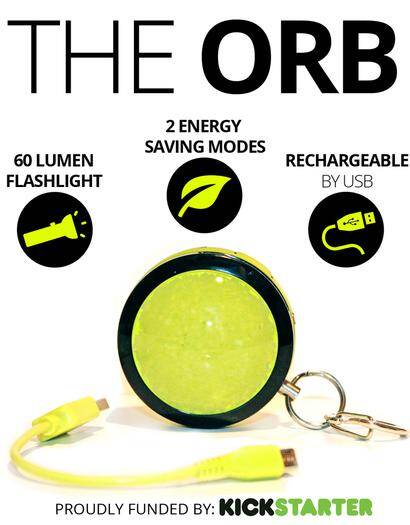 The Orb is a rechargeable flashlight and a reusable glow stick. It eliminates the need to buy replacement batteries and one-time use glow sticks. Its portable design makes taking a flashlight with you easy and its patent-pending energy saving concept will increase the battery life. The Orb has a lithium-ion rechargeable battery which plugs into any USB port (cable included), a hybrid mode which combines glow-in-the-dark and short bursts of light to increase battery life, and a dark sensing mode so that it will only turn on when it’s dark.